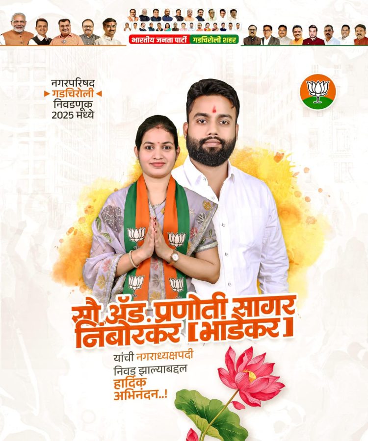 गडचिरोली : गडचिरोली शहराच्या राजकारणात नवा अध्याय सुरू झाला असून, भारतीय जनता पक्षाच्या नगराध्यक्ष पदाच्या उमेदवार प्रणोती सागर निंबोरकर यांनी दणदणीत विजय मिळवला आहे. शहरातील नागरिक, पदाधिकारी आणि कार्यकर्त्यांनी त्यांच्यावर प्रचंड विश्वास टाकत विजयाचा कौल दिला आहे.