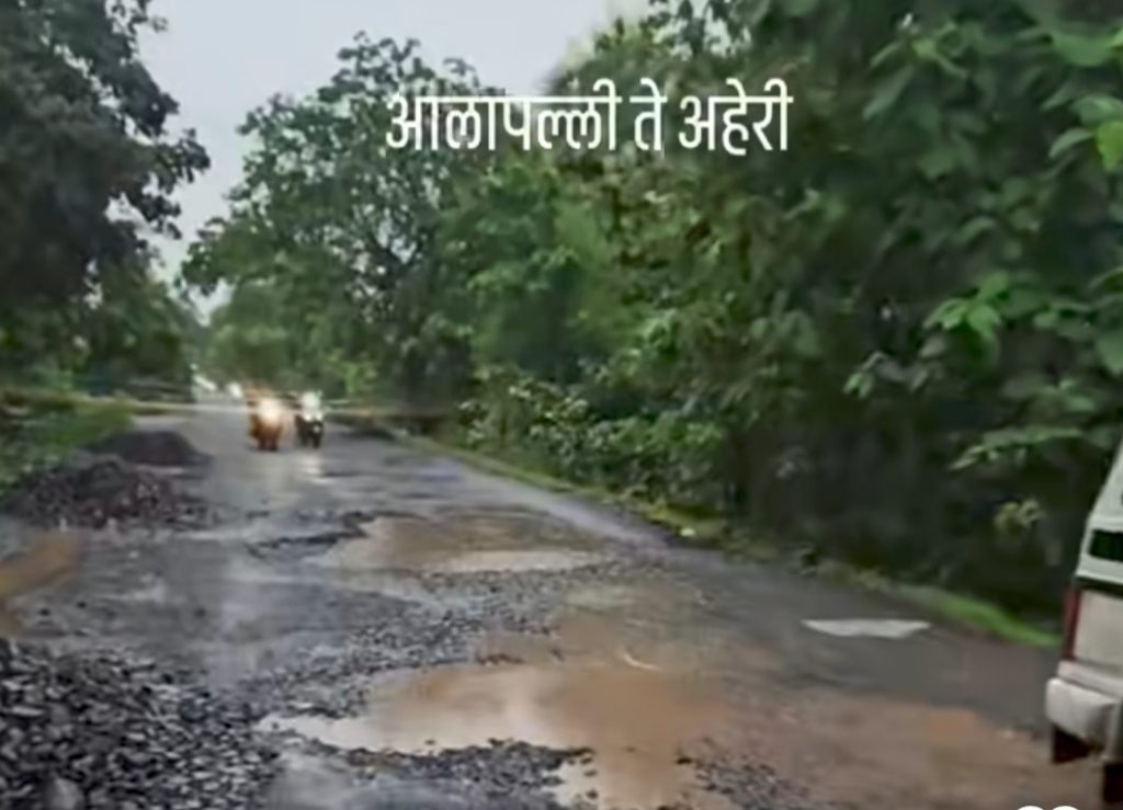 आलापल्ली- सिरोंचा महामार्गावरील खड्ड्यांत असे पाणी साचले आहे.
