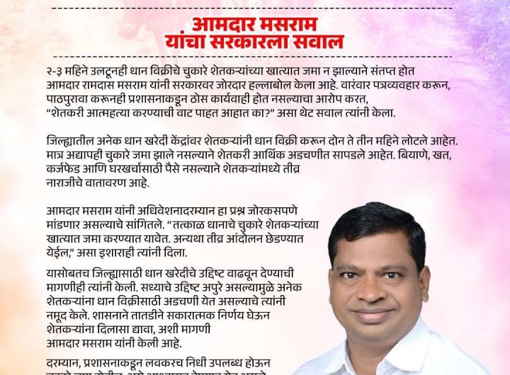 आमदार रामदास मसराम यांचा राज्य सरकारला सवाल आरमोरी – गडचिरोली जिल्ह्यासहित राज्यातील संपूर्ण जिल्ह्यातील शेतकऱ्यांचे मागील २-३ महिने उलटूनही धान विक्रीचे चुकारे शेतकऱ्यांच्या खात्यात अध्यापही जमा न झाल्याने...