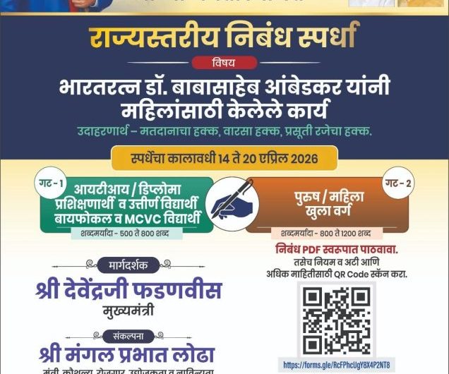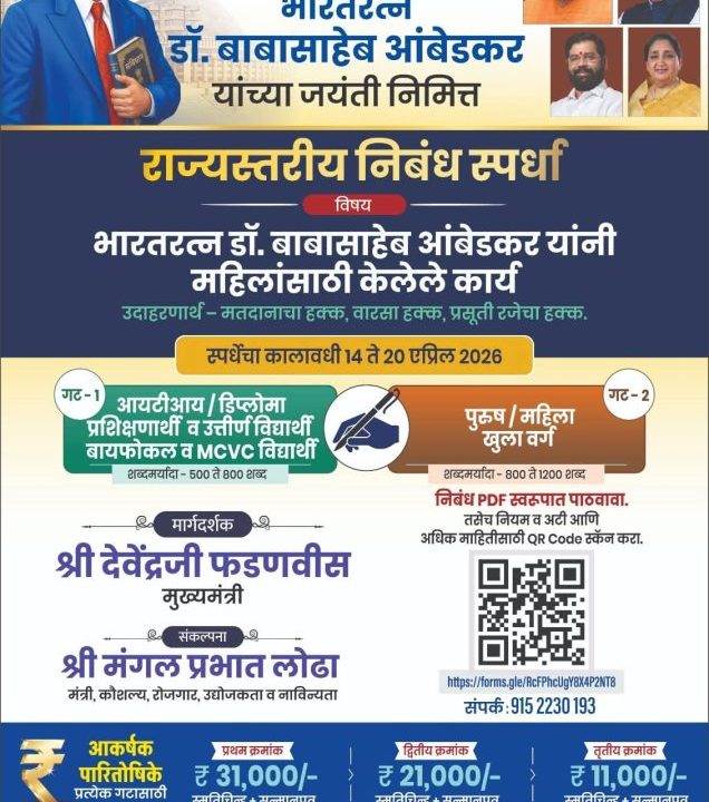 नितेश गट्टीवार गडचिरोली, दि.16 : कौशल्य, रोजगार व उद्योजकता, नाविन्यता विभागामार्फत भारतरत्न डॉ. बाबासाहेब आंबेडकर यांच्या जयंती निमित्त राज्यस्तरीय निबंध लेखन स्पर्धा आयोजित करण्यात आली आहे. या स्पर्धेत राज्यभरातील...