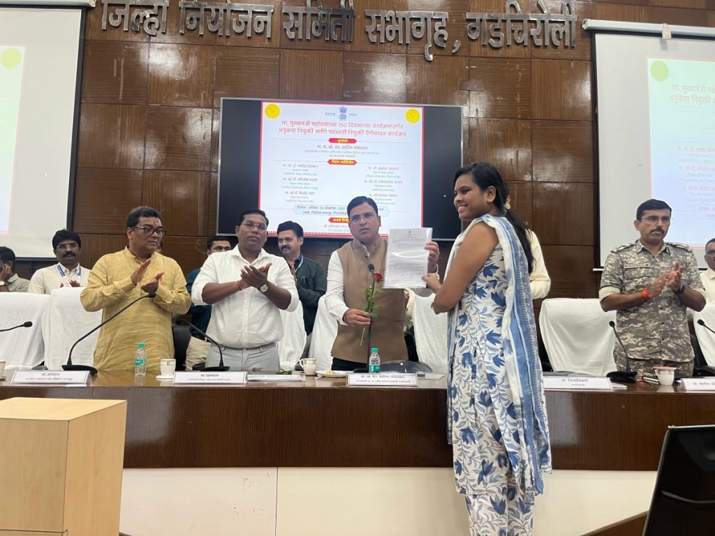 जिल्हाधिकारी कार्यालय, गडचिरोली येथे आयोजित कार्यक्रमात आज सहपालकमंत्री ऍड. आशिषजी जयस्वाल यांच्या हस्ते अनुकंपा व सरळ सेवेच्या प्रतिक्षा यादीतील उमेदवारांना नियुक्तीपत्र प्रदान करण्यात आले. गडचिरोलीतील नियोजन भवन येथे झालेल्या या सोहळ्याला सहपालकमंत्री ऍड. आशिष जयस्वाल यांचे सोबत जिल्हाधिकारी अविश्यांत पंडा, आमदार डॉ. मिलिंद नरोटे, माजी आमदार डॉ. देवराव होळी, जिल्हा पोलीस अधीक्षक निलोत्पल, जिल्हा परिषदेचे मुख्य कार्यकारी अधिकारी सुहास गाडे, उपवनसंरक्षक श्रीमती आर्या, अपर पोलीस अधीक्षक गोकुळ राज, निवासी उपजिल्हाधिकारी सुनील सूर्यवंशी, उपजिल्हाधिकारी स्मिता बेलपत्रे, आदी मान्यवर उपस्थित होते.