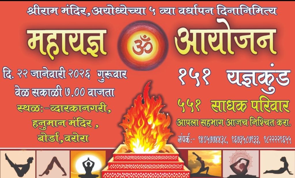 वरोरा : श्रीराम मंदिर, अयोध्येच्या पाचव्या वर्धापन दिनानिमित्त द्वारकानगरी, बोर्डा येथे भव्य महायज्ञाचे आयोजन करण्यात आले आहे. महायज्ञ आयोजन समिती, हनुमान मंदिर द्वारकानगरी बोर्डा, पतंजली योग समिती वरोरा तसेच विविध सेवाभावी संस्था व मंडळांच्या संयुक्त विद्यमाने २२ जानेवारी रोजी सकाळी ७.०० ते ९.०० वाजेपर्यंत हा सामुहिक महायज्ञ सोहळा संपन्न होणार आहे.