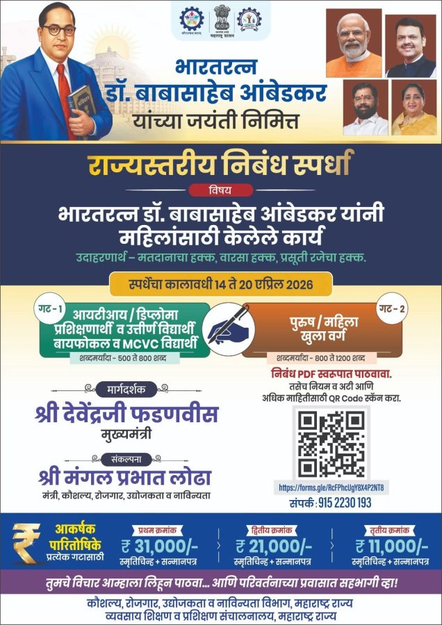कौशल्य, रोजगार व उद्योजकता, नाविन्यता विभागामार्फत भारतरत्न डॉ. बाबासाहेब आंबेडकर यांच्या जयंती निमित्त राज्यस्तरीय निबंध लेखन स्पर्धा आयोजित करण्यात आली आहे.