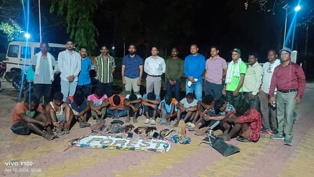दि. 19 एप्रिल 2026 रोजी सायंकाळच्या सुमारास जंगलात काही जण शिकारीसाठी लपून बसल्याची माहिती वनविभागाला प्राप्त झाली. त्यानंतर गस्ती पथकाने तत्काळ परिसरात सापळा रचून पाठलाग केला असता १२ जणांना ताब्यात घेण्यात आले. या कारवाईत शिकाऱ्यांकडून विविध वन्यजीवांचे अवशेष जप्त करण्यात आले.